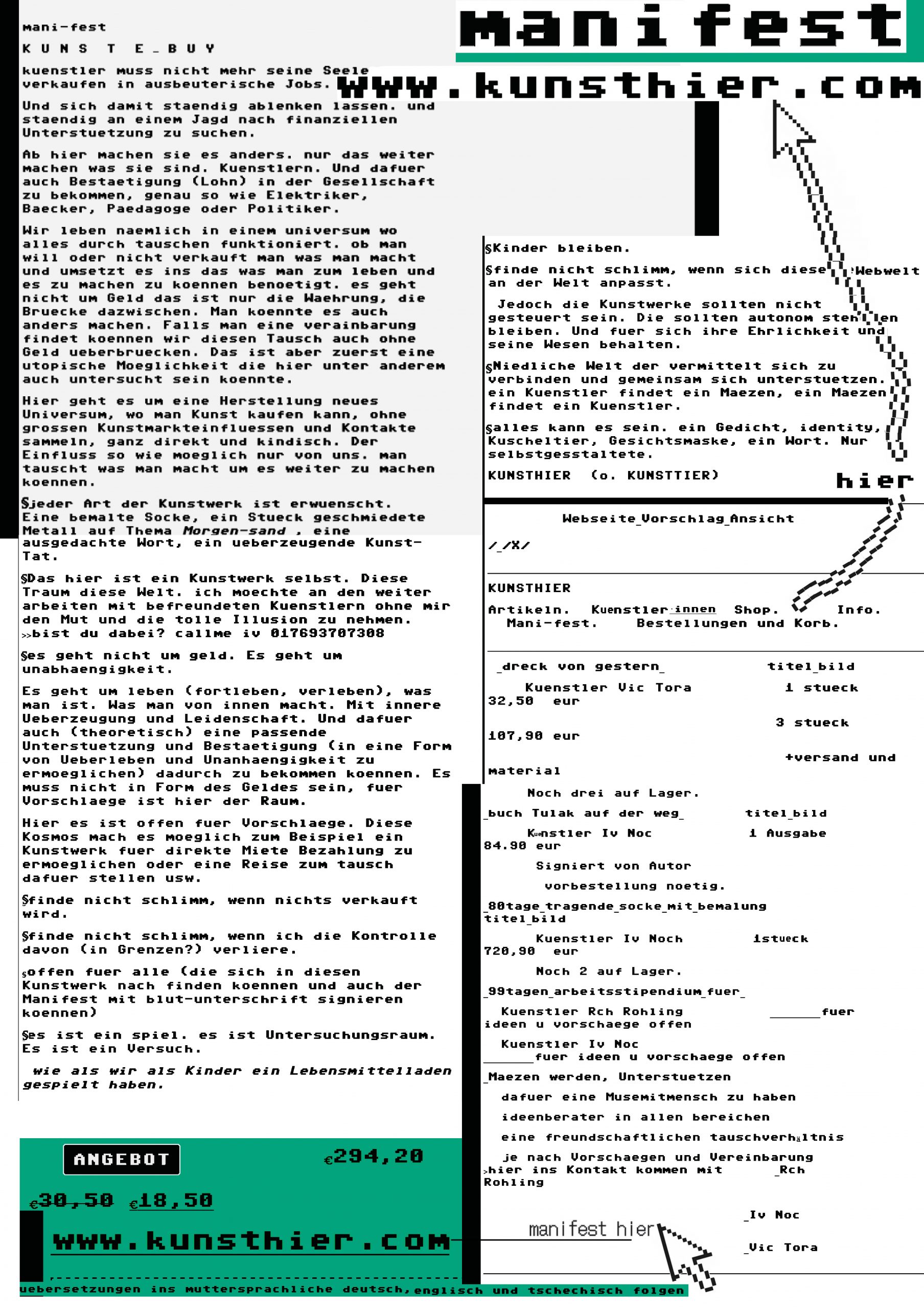 Kunsthier ist ein Manifest. Kunsthier ist eine Webseite. Da kann man Kunst kaufen und verkaufen, Mäzen finden.